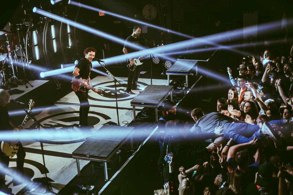 I make it to my standing room spot behind the barrier before vocalist Tim says they’re going to play some old stuff, some songs from “Revolutions Per Minute”. The crowd loses their minds. I can already tell I’m going to need to find a more comfortable spot to exist for the rest of the show. I look directly above me and see a vacant spot on the balcony. It’s not a very spacious spot, but it’s something. I swim through the masses and make my way up the stairs and to the balcony area I was eyeing before. This is much better.